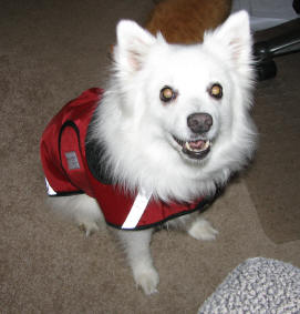 This little coat, BTW, is made by Doodlebug Duds right across the river in Oregon, and it’s nicer than some coats I’ve had! Nylon on the outside with reflective strips, fleece on the inside, and the collar turns up or down for really nasty days. It fastens on with a big velcro chest strap and a wide tummy strap, and comes off again just as quick. The first walk out she was putting up a good fuss, pretending she couldn’t figure out how to walk in it, but in no time she was romping around! I highly recommend it!