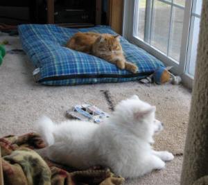 Mighty watches Barclay playing, with a surprisingly relaxed pose. I don’t know why the cats are even on the floor around him, but they seem to be warming up to him. I think they will be buddies someday.