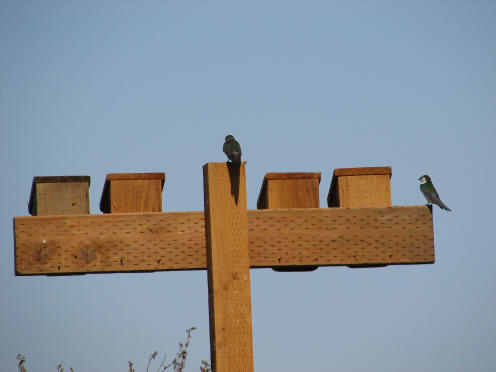 We also added a tall post with a row of four birdhouses (the crucifix looking post on the right in the picture above) . This is for the purple swallows who flit around over the pasture eating bugs all summer. Last winter the big four-hole birdhouse they lived in blew down and busted, and when they came back in the spring there was no birdhouse, so they moved on! So this spring when they arrived I got right to work and set this up for them. I see they are already checking it out. I hope they move in and stay all summer. They eat lots of bugs!