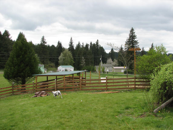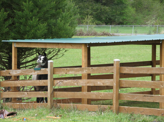We worked all day putting up rafters and putting the metal roof on. It was pretty easy, but it was a stretch even for Dave to reach across and get it screwed down. Everything is done except the stall on the end of the shelter is not completely enclosed yet. We bought 8 ft boards when we needed 10s! So tomorrow one more trip to HD should do the trick.