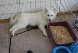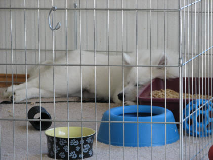 We’re having a little heat wave, and poor little Barclay has been feeling hot anyway, which is why he likes sleeping on the cold bathroom floor, snuggled up to the toilet, or lays in the bathtub with a little water in it. I remember Alki going through the same thing when she was a puppy. So today for the first time we had to turn on the AC, and Barclay parked himself over the vent to take a nap! Ah cool air, right on his little tum tum!