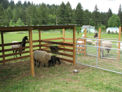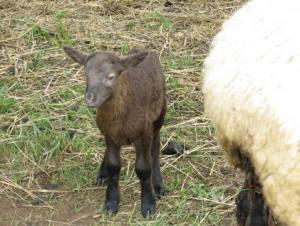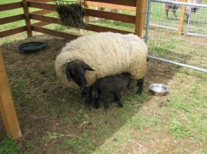 When we took in the sheep and goats and Houdini the ‘guard llama’, Annaliese warned us the ewe might be pregnant because of the ram that was with them (we didn’t take the ram, she found him another home). Well, sure enough, we went out this morning and found two new additions to our flock. When we spotted them Mom just had one lamb by her side, and we walked out to the pasture to investigate and found a bigger lamb in the grass nearby. We thought he was dead, but saw he was breathing. One of his legs looked funny. Mom was headbutting the other animals that got too close, so we picked up the lambs and mom followed us over to the shelter, and we shut them in and shut everyone else out (except for little Gracie the goat, who can go through the gap under the gate).