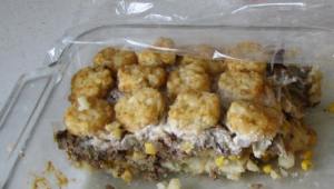 In a 9×12 glass baking dish put down a layer of tater tots on the bottom. Put ground beef mixture over it, smoothing it out. Now pour on the soup, spread it out a bit to get it even, then give the pan a few little shakes and jiggles to make it sink down into the meat. Put another layer of tater tots on top.
