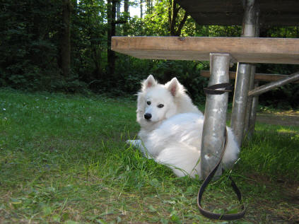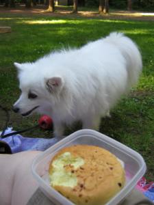 Once we got there and I laid out a blanket and tied the pooches to opposite ends of the picnic table, I turned to grab my sandwich only to find that while I was tying Barclay, Alki pulled the sandwich out of the pack, opened the container, and was munching on my bun!