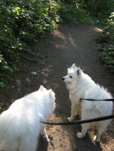 I got the crazy idea yesterday afternoon that I would pack a sandwich, drink, and a book, and take the dogs to the park and have a dinner picnic. My only regret in this was 1) letting Alki see me prepare the kongs I brought along for them before we left – because she spent the entire walk obsessing about when she would get the kong, and then stole Barclay’s too! and 2) taking both dogs, because it was like having two little kids in the backseat on a long car ride! They cannot be happy sniffing the same bush, or one being ahead of the other. Actually, it’s all Alki who had her nose out of joint. Barclay is way too laid back to be much trouble. So I spend the whole time untangling leashes and being alternately pulled forward or dragged behind.