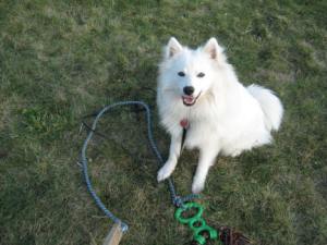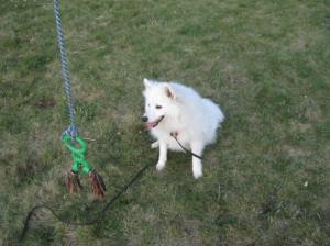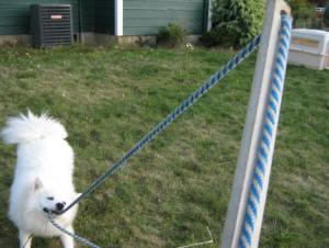 I built a ‘flirt pole’ for Barclay. This is a dog toy that is similar to a ‘cat fishing pole’, where you have a dangly toy on a stick and the cat goes nuts for it. Well, same thing, but dog sized! I took a stick, drilled a hole in the end and put an old rope through it, knotted one end and tied a toy to the other. Because the rope goes through the stick I can pull it back and make the rope longer or shorter depending on what game we’re playing with it.