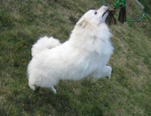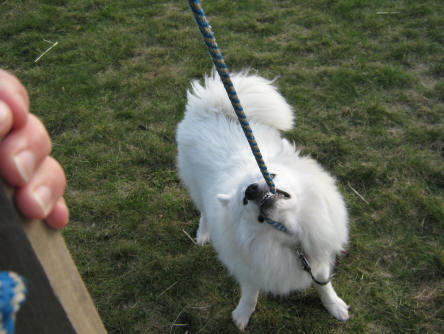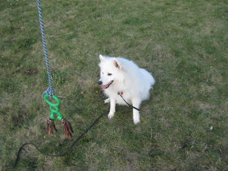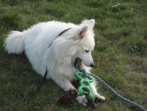 Nothing sweeter than chewing on your catch! Barclay had no interest in this toy until I tied it to a rope!