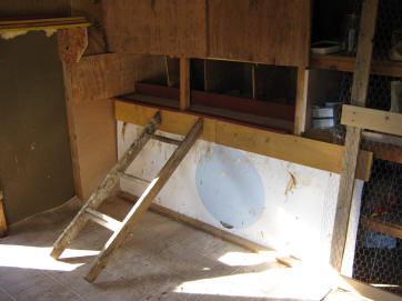 I started rebuilding the nest boxes, expanding to four instead of just two – not that two hadn’t been enough, just that now there was room for four. I kept a piece of the ladder for the hens to use to climb up there.