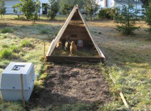 I love this chicken coop! Might be a good way to “kill 2 birds with one stone” (yikes, did I say that!) I will expect a report at Area 33 on how well it is working!>>Can a critter turn the coop over and nab the chickens?