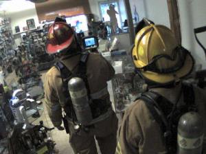 Yikes! Firemen in our store! Well, luckily we’re insured. Dave hopped in the car and headed down there while I called the alarm company. They were very good. They got the alarm activation and could hear voices in the store, and so they called the police just like they are supposed to. The police told them there was a fire incident in progress and that there were police there already.