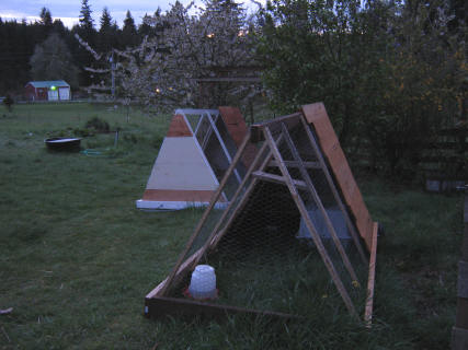 By dark mom had still not taken the chicks back into the coop, and she seemed to be settling down for the night under the ramp. So I took a rubbermaid container of cedar chips and carefully reached under her and picked up each of the three chicks and carefully set them in it, then I picked her up, and she only grumped a little, and set her in it, and she snuggled right on top of the chicks. Then I was able to carry the container to the new chicken tractor and set her and her new family safely inside.