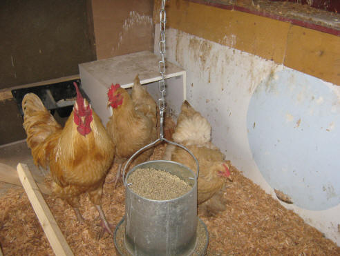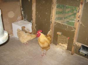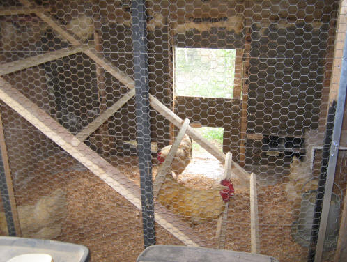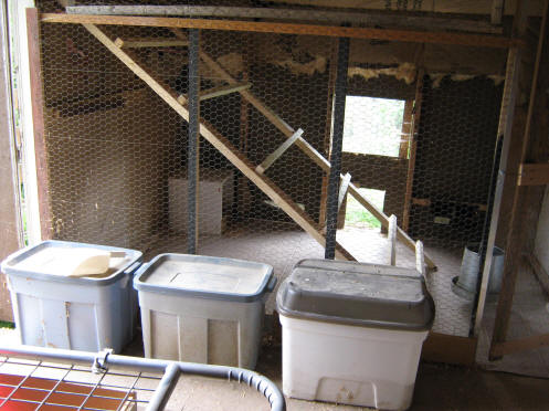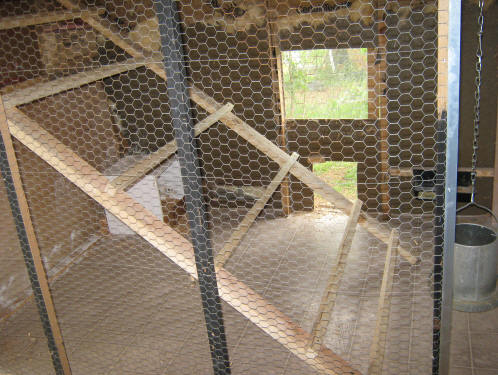 In it’s place I built a big roost. It’s like a big ladder, and it’s hinged to the wall at the top, so I can lift the bottom and hook it to a chain in the ceiling and get it out of the way for cleaning. I saw one done that way on the net and thought it looked clever.
