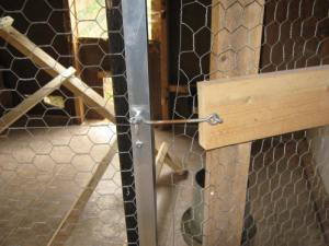 I also put a piece of aluminum angle on the edge of the doorway where there was rough chickenwire always sticking out to catch you as you walked in and out, and put a latch on the door so I wouldn’t have to just slide a feed bucket in front of it to hold it closed. I can latch it from the inside too, so Barclay can’t follow me into the coop anymore. A few weeks ago he followed me in and ran out the chicken door into the orchard and chased chickens around until I pounced on him and stopped him.