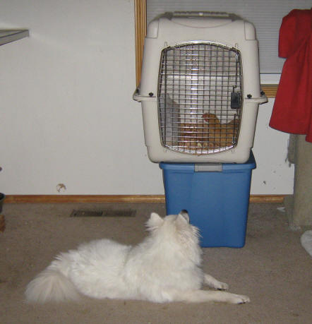 Barclay is frustrated by Copper’s presence in the house. He thinks Copper should be out in the yard being chased, like my other bad wandering chickens. I had Barclay trained to where he would watch a chicken walk by without chasing, but lately I have had four pesky chickens who know how to escape the orchard and go wandering the yard, and I never know when we’re going to walk out the door and find them there, and so he has gotten into the habit of chasing them again. Hopefully he’ll learn to ‘leave it’. As I work with training Copper, I’ll work on Barclay too.