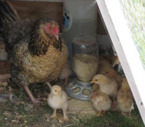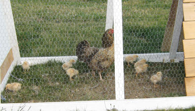 In the other tractor is black mama hen with her NINE chicks! I thought there were only eight, but now that they are running around more we counted nine. I would love to let all these little guys loose to run around the yard and scratch in the fresh grass, but the cats would go after the chicks. So everyone stays safely in the tractor.