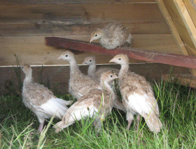 The turkey poults have made the big move from the protection of the heated brooder to the cold harsh reality of life in a chicken tractor. I was worried about them the first night, and for some reason, just because they are turkeys I guess and not very bright, they chose to sleep on the unprotected end of the tractor in the grass instead of the sheltered end with a perch. But they survived, and by the second night they had figured out how to snuggle up together on the perch.