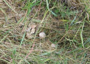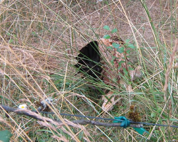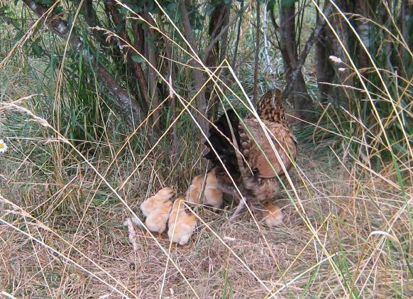 Barclay pointed out the empty eggshells in the nest. So here’s the funny part – the nest is in the backyard. In the overgrown old garden. No more than 10 feet from the chicken pen, the water trough, and the gate to the orchard. In other words, this whole time she has been sitting on her eggs literally under our noses! How come the dogs never bothered her? They must have known she was there, but she wouldn’t run and flap – she probably just fluffed up and hissed at them, and the dogs backed off. Even when our friends visited with their dog Sam, who chased the rooster around the garden, she was right there in the middle of it not budging off her eggs – what an amazing Mom! Now, how did she lead that little troupe of chicks from the backyard back into my carefully secured chicken pen?
