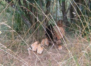 Yay, it’s Big Red! She has returned, and she brought a whole herd of little peeps with her! 9 or 10 by our count. They’re really hard to count, they follow mom around like a cloud!