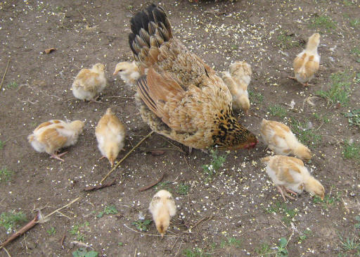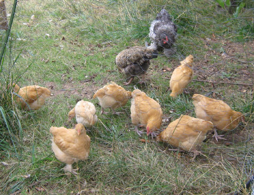 Yes, buff orpingtons, so the biggest chicks are all Buff O or buff cochin. Big Red and her sister, the black mama hen are americauna x game hen, I think. So the smallest chicks are all Big Red's crossed with Big Bird the late great Buff O rooster, so it will be interesting to see how they turn out.