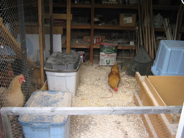 The chicken playroom. Ok, it’s not a lot more room, but they can entertain themselves by climbing into the brooder box where the turkeys were, and hopping up on shelves and boxes and things (which chickens seem to like to do when they get the chance). Just a bit of extra space so they don’t start getting grumpy and picking on each other. I hung a big shoplight in there on a timer to run from 7 am to 7pm, and put up a smaller fluorescent plant light as a night light so they can find their way back to their roosts after the big light goes off.
