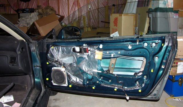 Dave’s car is a 1993 Dodge Stealth, and for the last few months we’ve had a broken window regulator on the passenger side. When I first looked for a replacement part, it was around $170! So we wedged the window up and put up with it for a few months. After Christmas we decided to splurge, and found the part for around $100, so tonight I spent a fun evening installing it.