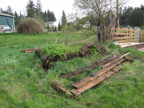 Two of the upright posts were surrounded by a giant anthill. I pulled them out and tossed them into the wagon, and then realized that they were hollowed out and most of the ants were living IN the posts! So what to do with them? I know someone who would enjoy a couple of ant-filled logs…