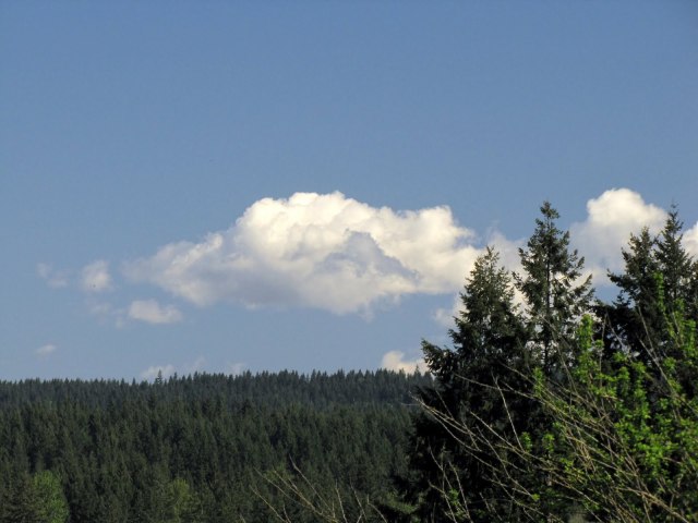 I had to look out over the hills to find any clouds to take pictures of. I love the blue sky, white cloud, green trees in this shot. That’s the northwest in a nutshell.
