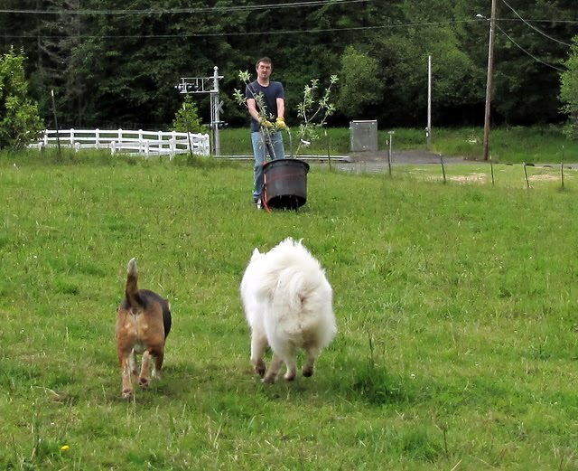 We took advantage of the break in the weather today to plant some of our apple trees. The new orchard will be out in the front pasture, near the end of the driveway. I spent quite a bit of time hauling tools and waterhose out there (had to find the hose, untangle it, run it out there), and then Dave came out to help with the hard part.
