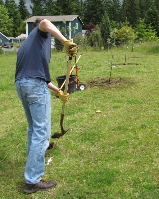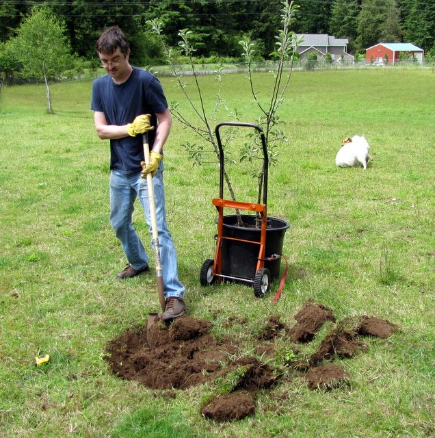 Dave and I shared hole-digging duty. Because our pasture is heavy clay, we have had problems with trees not growing well and surviving out there. The latest thing I’ve read is to dig a hole that is shallow and wide. This is supposed to break up soil to let the roots have a better chance of digging in. Also, it keeps the tree high up so nutrients can get to the roots easily. I’ll go back and mulch on top of the planting area.
