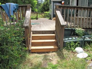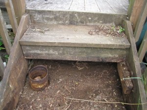 So I measured the old pieces and Dave went to the hardware store and picked up some pressure treated lumber, and we whipped up new stairs. No coffee cans in our plan. They came out nice and solid. I hope they last as long as the last set. Now I need to finish cleaning and re-treating the decks – something we’ve been putting off for years. They are on the must-do list for this summer. I’m afraid any more neglect and it will really cost us.