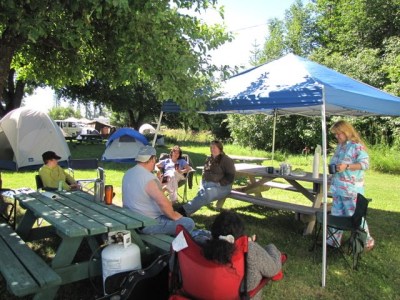 The rest of the day was spent relaxing around the fire, playing a little music, eating a great pork chop dinner (I made gravy), and then BSing around the campfire. Quite a bit of discussion concerned the porta-pottys which the tenters were having to use (lacking an Airstream with lovely bathroom facilities). Because of another large group nearby also using the pottys, things were starting to pile up, so Gary saved the day by taking a big stik and ‘stirring the pot’. Nasty, but it helped a lot, and the pottys managed to last out the weekend.