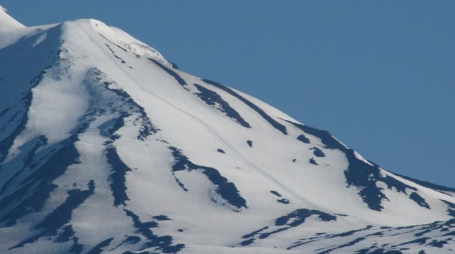 Saturday morning, with the light just right, we could clearly see the route up the mountain. When people climb Mt Adams they hike up, and slide back down, and the long line in the snow is the glissade path.Β