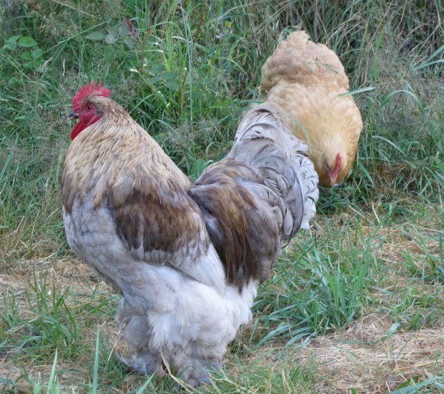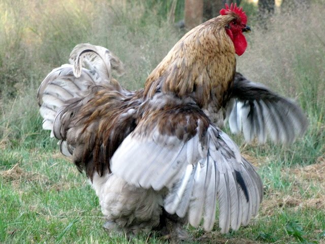 Then Big Blue came over to check her out. Having a new hen around put him in a very flappy mood!