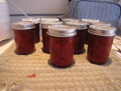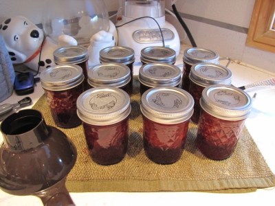 For the second batch, I did a low-sugar recipe, and instead of pectin I used a modified food starch called Clear Jel. That thickened up very nicely. Processed it for ten minutes, and then it was ready to cool on the counter.