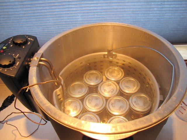 This is a MasterBuilt Indoor Electric Turkey Fryer. I spotted it on craigslist and snapped it up after doing a little research and confirming my suspicions that it looks like a perfectly serviceable electric water bath canner. It has an element inside, and a metal basket sits on top of that. It has an adjustable thermostat, and a glass lid so I can keep tabs on what’s going on in there. It cost $75, and was like new, even in the original box and well taken care of. Electric water bath canners cost about $300, and I knew I could never justify buying one of those – this is right in my price range!