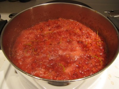 Currants have tiny little seeds, and are very tart. I cleaned them and pulled off the bad ones, and put them all in a pot with a cup of water and set it to simmer.