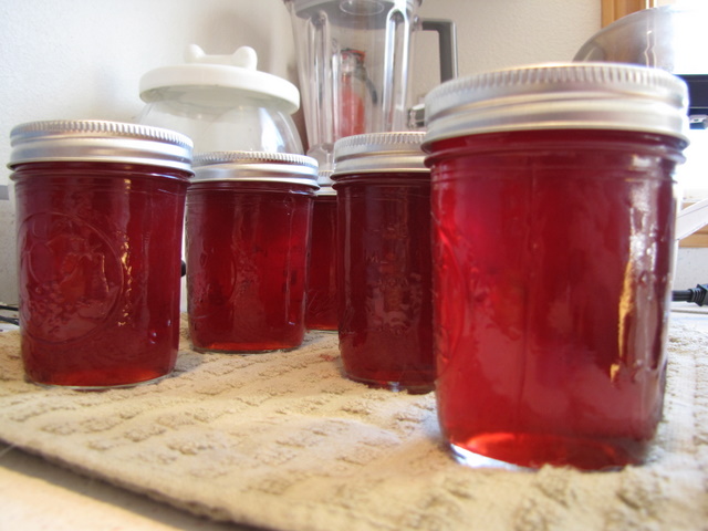 Update: I didn’t get any pictures of the actual jelly making. I ended up with 5 1/2 cups of very thick juice, and the instructions said I needed 6 1/2 and I could add 1/2 c of water to get there -so I went ahead and added a whole cup. I followed the instructions on the pectin packet, but this stuff was so thick, I’m not sure it needed pectin at all. It was setting up before I got it out of the pan! I made 8 half-pints. Processed them in my electric turkey fryer/water bath canner. That canner makes the whole process so much easier. I’m spoiled now!