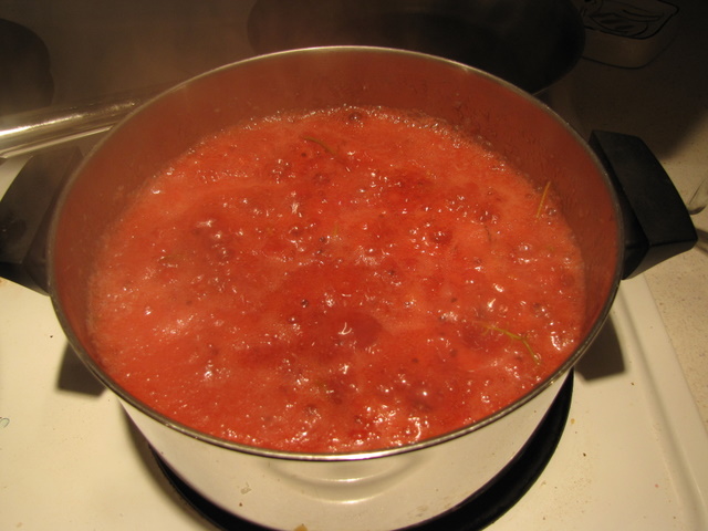 Half a flat of berries reduced to one jelly bag. I got about 2 cups of juice, and I need 4-5. So more tomorrow.