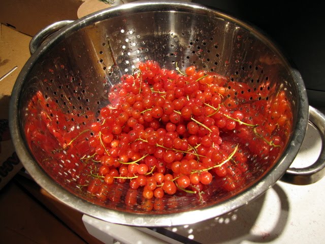 I went to the farmers market Saturday and picked up a flat of local Currants. I was interested as soon as I saw them, because Grandma used to go on and on about how great Currant jelly was, and how hard it was to find. The lady selling them had brought some of her own jelly along to give samples from, and it tasted great. So I took the plunge and bought a whole flat of them.