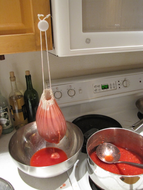 Stems and all! Then I packed it into a jelly bag, and hung it over a bowl to drip out all the juice. Before going to bed I put what had drained out into a container in the fridge, and left it hanging overnight.