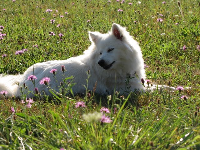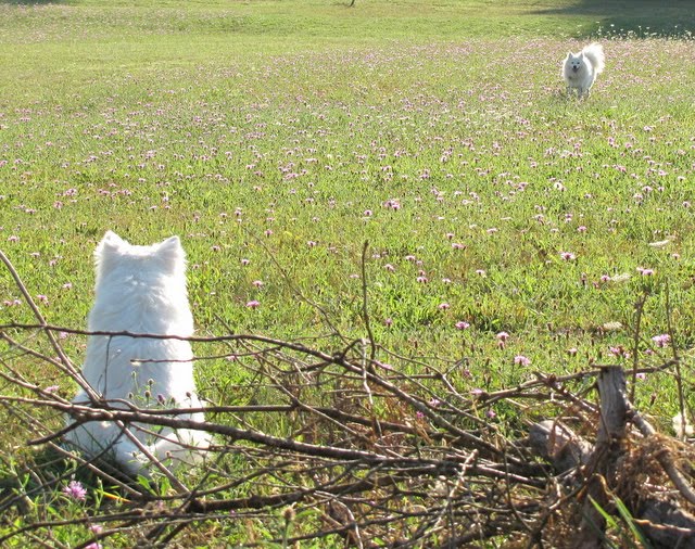 Our pasture is full of wildflowers, or as I like to call them, invasive weeds. It’s all a matter of perspective. They’re pretty, but if you don’t keep them under control the county will show up and talk to you about it. So I mowed about a third of it the other day, then let the dogs out to play for a bit before I finish the job.