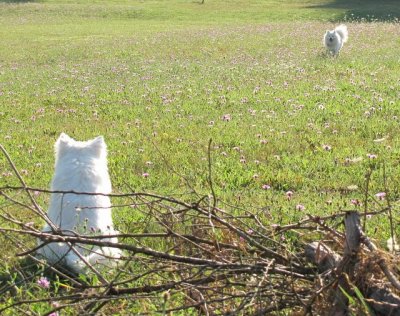 Navi walked all around the field with me, then waited for Barclay to catch up. He kept stopping to dig up field mouse holes.