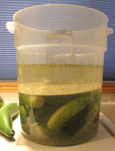 I have a food-safe bucket, and cleaned the pickles, removed the blossom ends, and weighted them down in the brine with a plate. Now I just need to clear the scum off the top every day or so until they stop bubbling, and I should have pickles. I’m a skeptic – maybe people have been doing this for 10,000 years, but I still need to see it for myself!