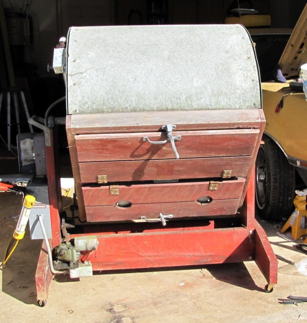 It was a beautiful day today, so I went ahead and wired the new cord into the fusebox (the old one looked like it had been mowed over and cut off). I rolled it out in to the driveway and hesitantly plugged it in. The fan came to life inside the drum. The light came on as the heater warmed up. Finally I threw the switch for the drum motor, and the whole thing slowly hummed as it tilted forward! It works!