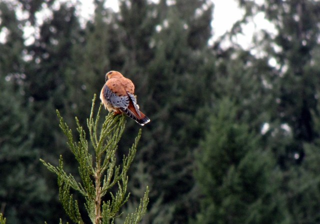 First off, a kestrel came and landed in the tree right by the yard where we were playing. This is the best shot I could get of him. They are lovely birds, and I’ve seen them munching on big grasshoppers and the like. Although they are predators, they are much too small to bother the chickens!