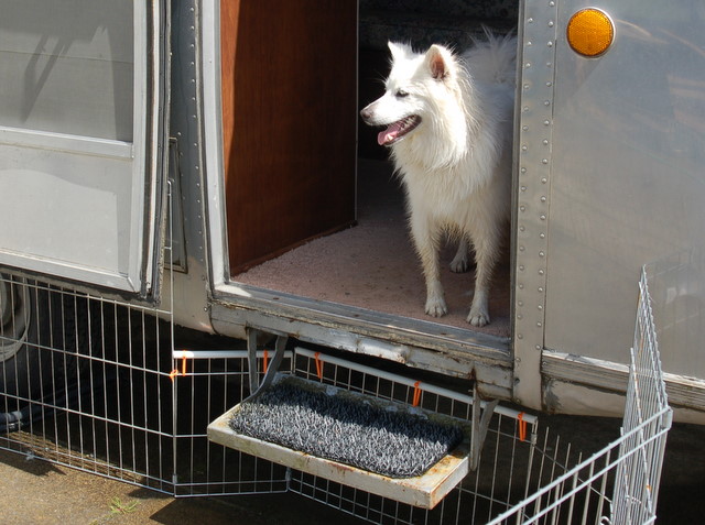 I ended up cutting a panel in half, and then cutting one of the halfs in half again, and made this three piece panel to go under the step. I topped it with some flexible water pipe to protect our hands (you can see the pokey side on the right I have yet to do). This will make it so we can just open the trailer door and let the dogs out into the yard. That will be really nice for morning potty breaks! Also I won’t have to worry about Navi dashing out the door running off to annoy the neighbors.