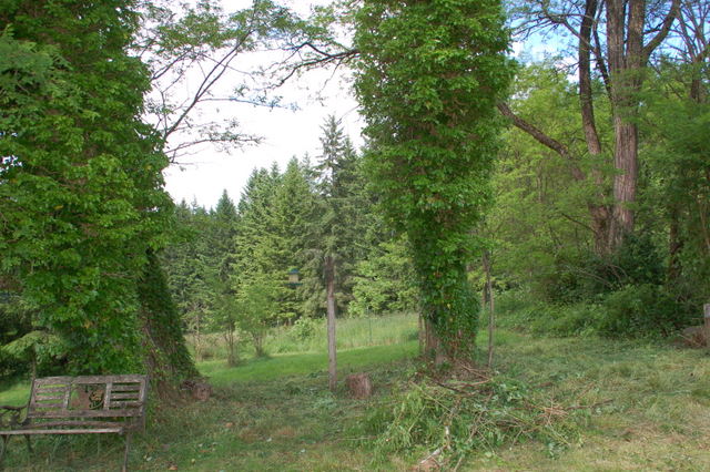 And the trees are Thorny Locusts, which have these terrible stiff thorns on them which will go through anything – pants, leather gloves, lawnmower tires. And the locusts send up little baby trees all over the yard so there are lots of tiny saplings mixed in with the blackberry vines, just waiting to jab you!