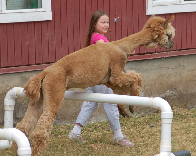 And my jaw dropped at seeing how high that pole was for that alpaca to jump….it's the same height as the pasture fence! I wouldn't be encouraging my critters to jump that, lest they think about escaping their yard. gah!