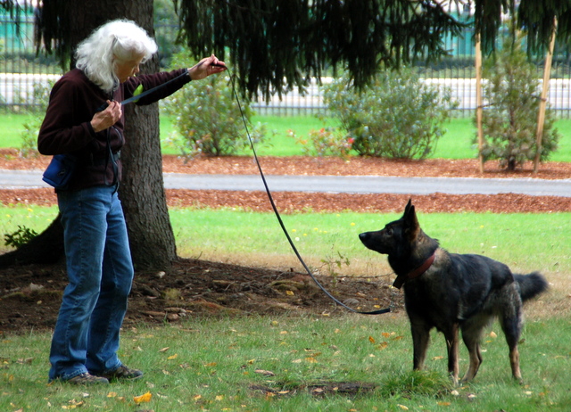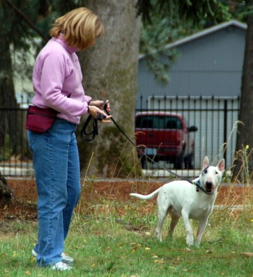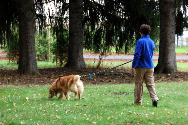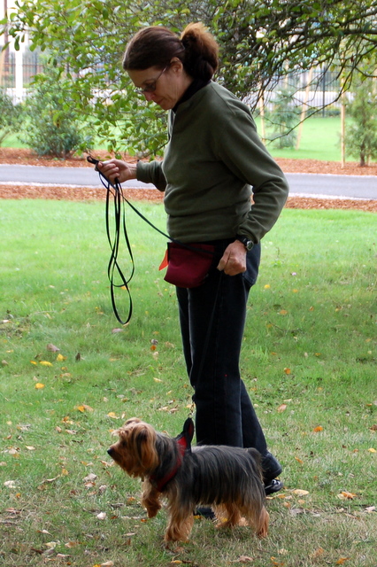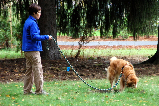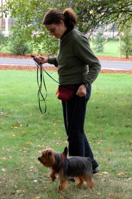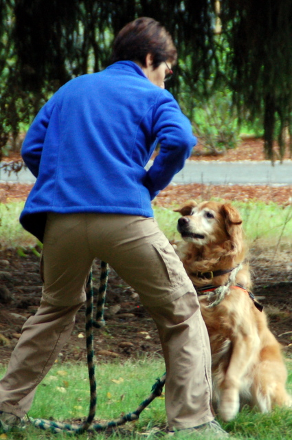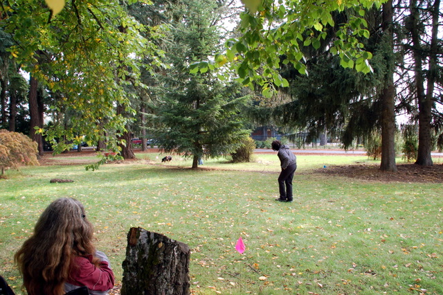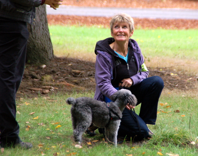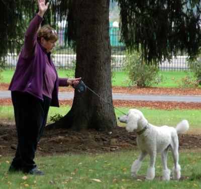 This is the trial area. The judge is standing about in the middle, and I am near the starting line. The dog and handler are behind a tree at the far end of the field.