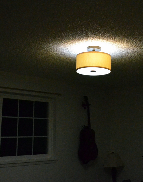 So today we took it down and replaced it with a nice ceiling fixture. We picked one that had a sort of clean, retro look to it, with a cloth shade. I quite like it.